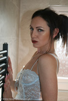 Lingerie clad Kiera strips for her bath
